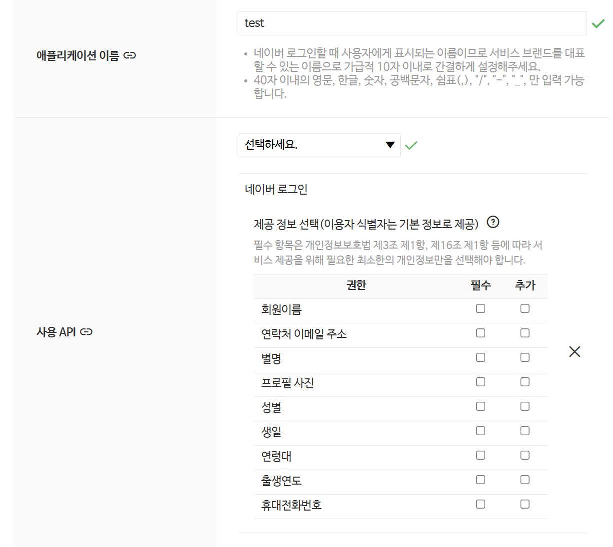 앱 등록에 들어가면 먼저 이름과 사용할 api를 선택해야 한다. 네이버 로그인을 선택하면 아래에서 정보 요청시 받아올 내용들을 선택할 수 있다.