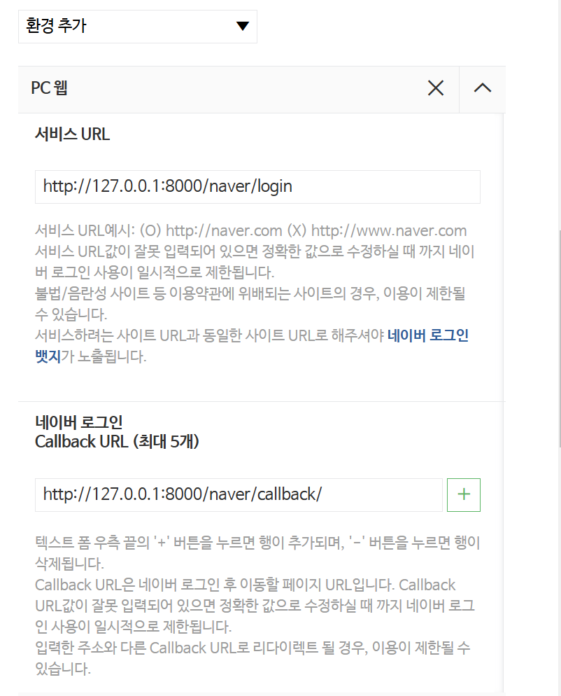 NAVER_REDIRECT_URI = 'http://localhost:8000/naver/callback' # 본인 Callback url