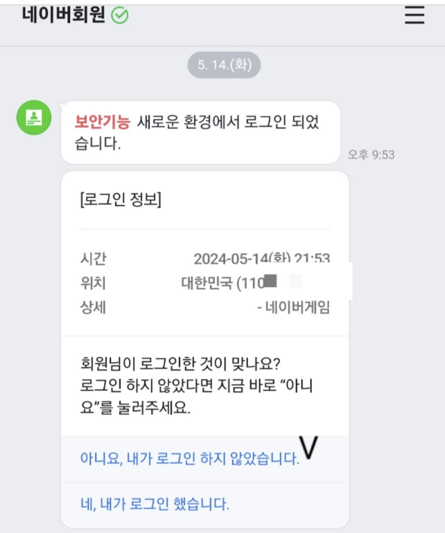 [네이버] 새로운 ip에서 접속했을 때 전송되는 확인 메세지