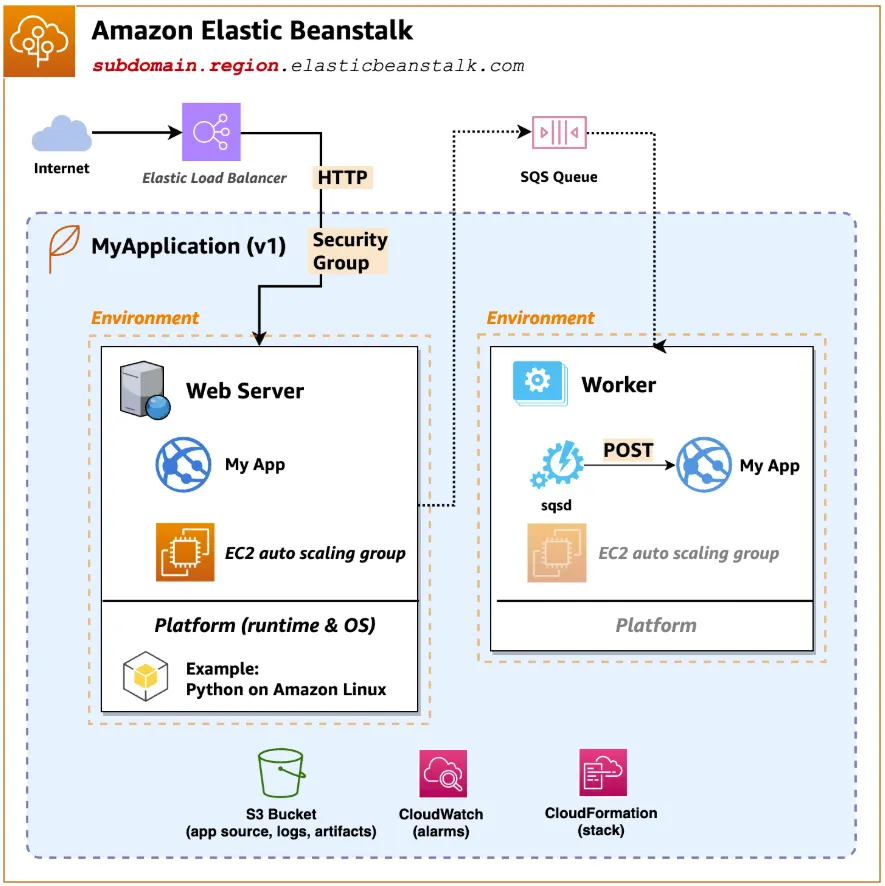 이름에서 알 수 있듯이, Elastic Beanstalk는 애플리케이션을 지탱하고 성장시키는 기반 구조를 제공하는 PaaS(Platform as a Service) 서비스입니다.