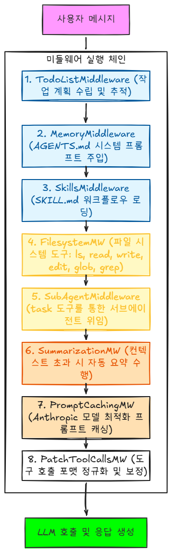 이 프로젝트에서 가장 눈에 띄는 설계 결정은 미들웨어 패턴이다. 에이전트의 모든 능력 계획, 메모리, 파일 조작, 서브에이전트, 컨텍스트 관리를 각각 독립적인 미들웨어로 정의하고, 순서대로 요청/응답 파이프라인에 끼워넣는 방식을 택했다.