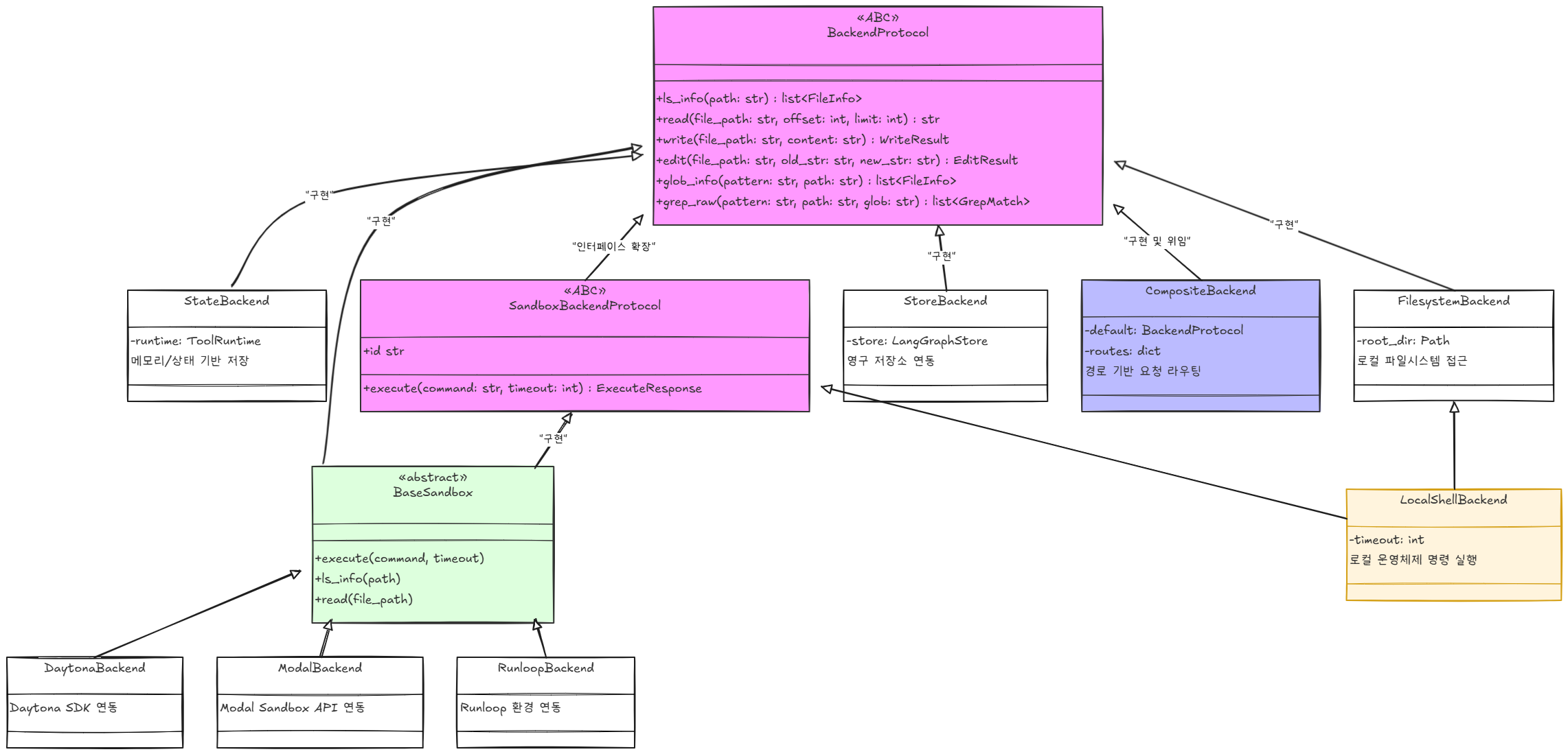 두 번째로 눈에 들어온 건 BackendProtocol이라는 추상화다. 에이전트가 파일을 읽고 쓰는 모든 동작이 이 프로토콜 위에서 이루어진다.